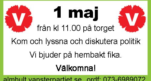 Vänsterpartiet i Älmhult firade 1 maj ihop med Socialdemokraterna, något vi har gjort i rätt många år nu. I år hade vi EU-parlamentarikern Malin Björk som talare. Hon talade bland annat om vikten av trygghet, och att trygghet inte enbart består av fler poliser. Hon sa att det behövs mycket mer grundtrygghet i form av bra vård, skolor, äldreomsorg. Hon tryckte på att vi måste vara rädda om varandra, och vara medmänniskor och inte motmänniskor. Hon sa att det inte funkar att genomföra när vi har ett av europas minst utjämnande skattesystem, som idag är riggat för de rikaste, och att det är något som måste ändras på. Malins tal går att se längst ner på denna sidan, via vår Youtube-kanal.